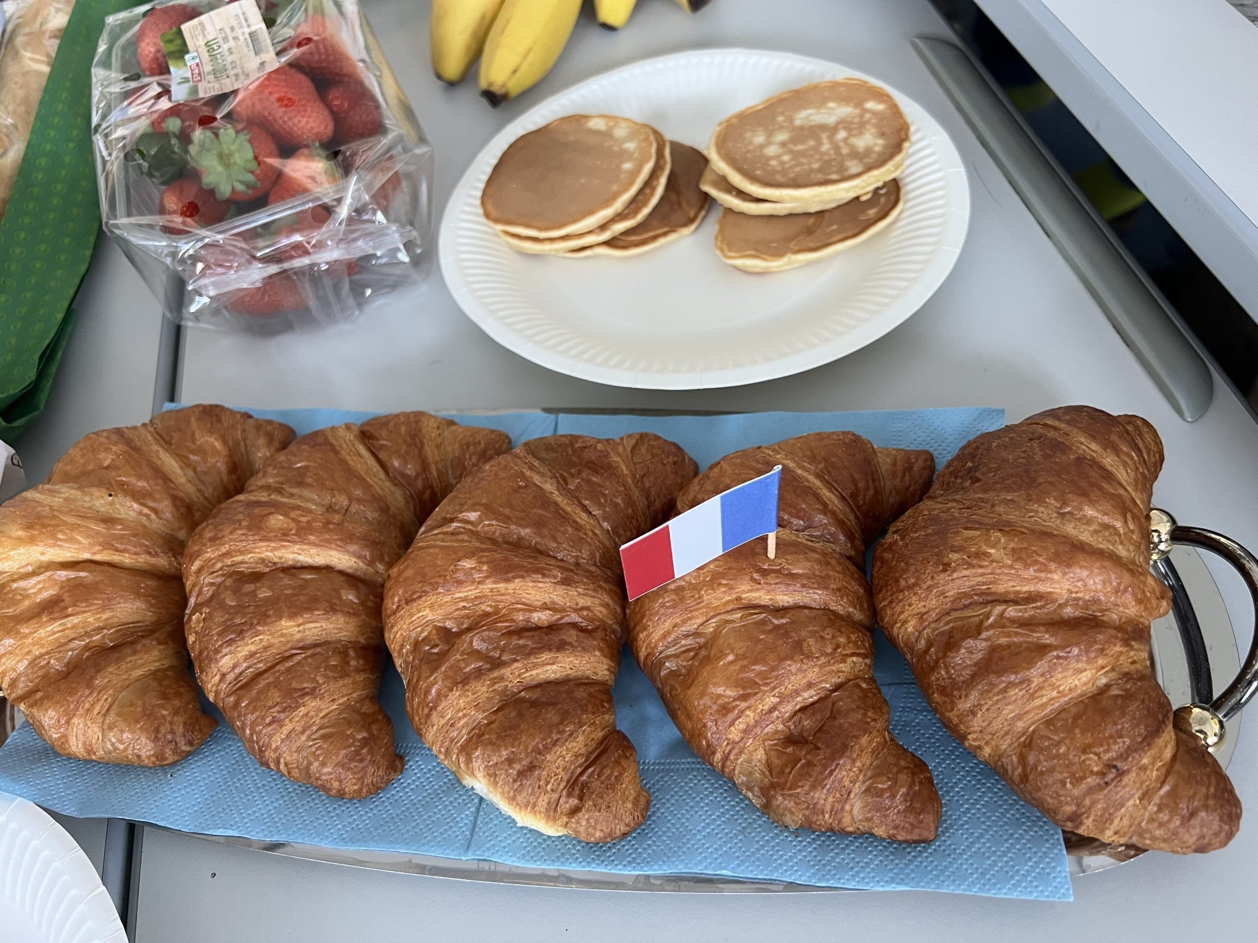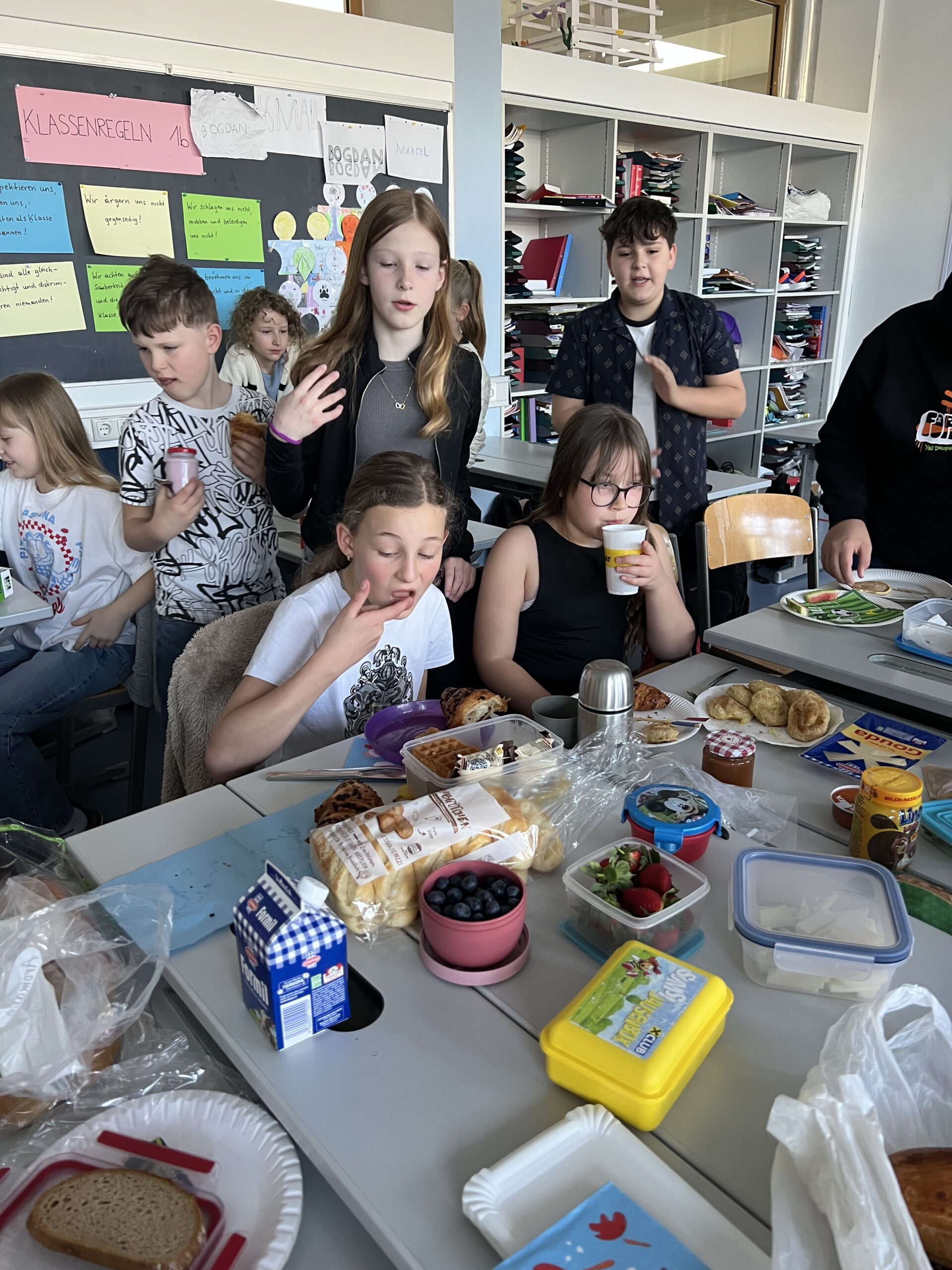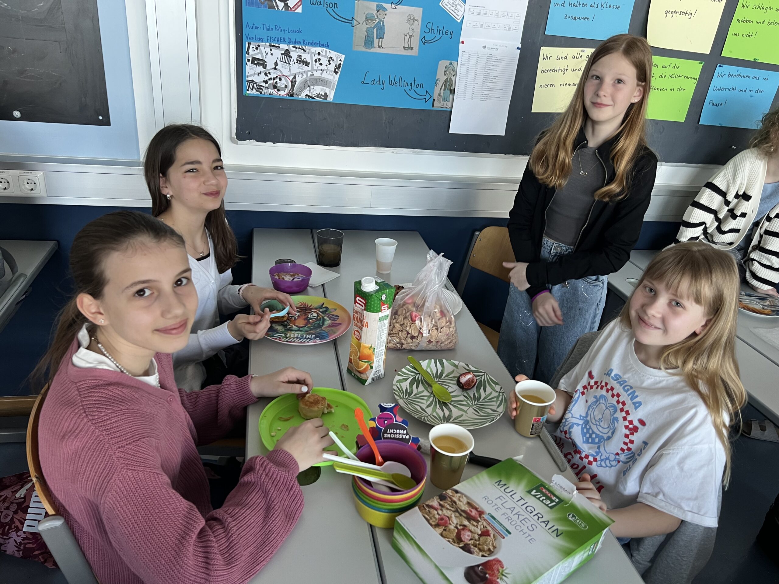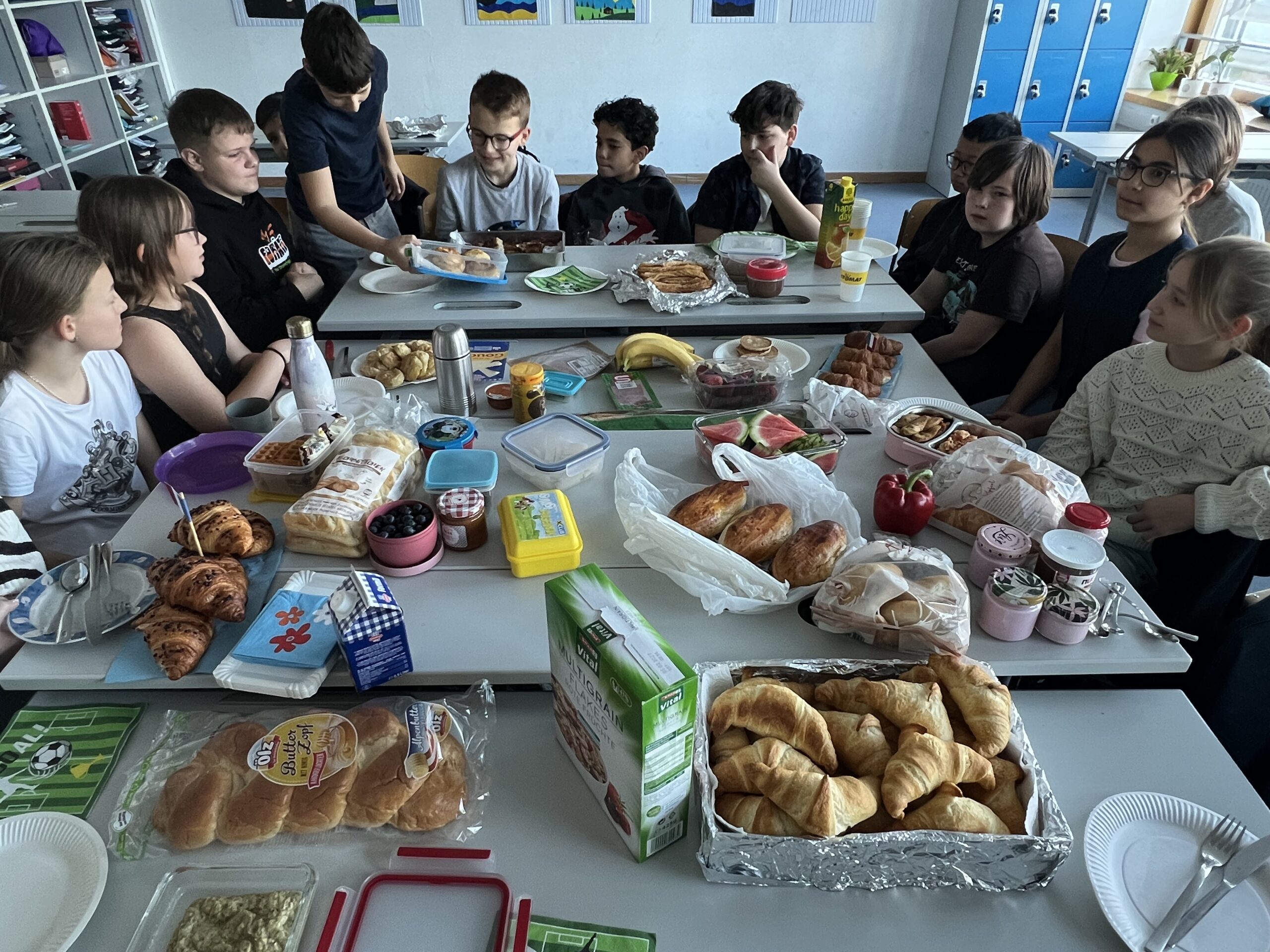 Im GWB-Unterricht beschäftigen wir uns zur Zeit mit Lebensmitteln wie Reis, Fisch, Früchten, Mais, Soja usw., die aus den verschiedensten Regionen der Erde bis zu uns nach Hause auf den Tisch kommen. Aus diesem Anlass hat sich die 1b am Donnerstag (23.4.) zu einem Klassenfrühstück versammelt. Jeder Schüler/jede Schülerin hat dazu ein paar Kostproben aus seiner Frühstücksküche bzw. aus seinem/ihrem Kulturkreis mitgebracht. Ein echter Genuss!